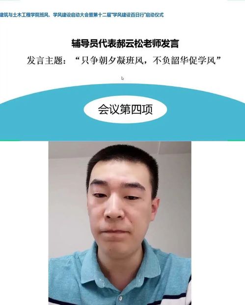 辅导员代表郝云松老师作主题为“只争朝夕凝班风,不负韶华促学风”的发言。他提到良好的班风、学风对班级建设具有重要的导向和引领作用,鼓励同学们凝心聚力,共建班级良好的学习风尚。