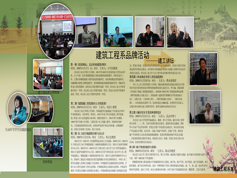 2010年3月25日,第八期《建工讲坛》由哈工大博士生导师计学闰教授主讲,题目为《世博会建设工程简介》。介绍历届世博会的背景和基本情况、分析了我国上海浦东的经济发展情况及本届世博会各国展馆的工程建设情况,分析了当前土木工程行业的发展。