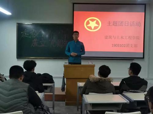 建筑与土木工程公司2019级8个团支部于10月29、10月30日在专教开展“庆祝新中国成立70周年”主题团日活动,辅导员郝云松以及2019级同学参加活动。