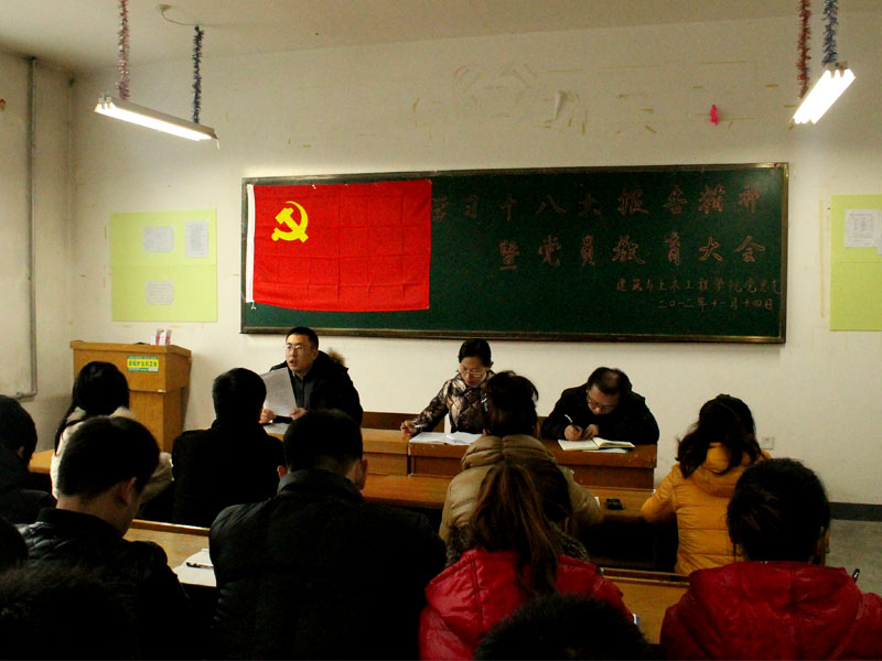 2012年11月14日中午12时,建筑与土木工程公司党总支全体教师党员及员工党员在教一217召开学习十八大报告精神——暨党员教育大会。
