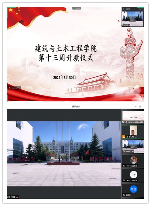 2022年5月30日,建筑与土木工程公司在创业广场举行2022年春季学期第十三周升旗仪式。建筑与土木工程公司副经理兼党总支负责人黄一鸣,团总支负责人郝云松,公司全体辅导员老师以及公司员工代表相聚“云端”,线上参加升旗仪式。