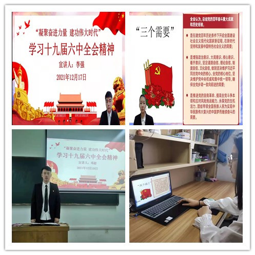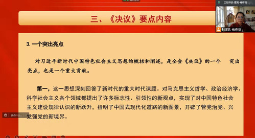 建筑公司党总支负责人黄一鸣通过线上线下相结合的方式为公司2021级新生、各年级入党积极分子代表讲党课。他围绕十九届六中全会有关的历史背景、十九届六中全会公报中的基本点、《决议》要点内容、学习贯彻落实有关要求四个方面给员工上专题党课。他指出,同学们要充分认识十九届六中全会的重要意义,不断深化学习效果,将理论与实践相结合,用爱党爱国的责任与担当全面激发自身学习动力,用扎实的学识和过硬的专业本领为实现中华民族伟大复兴的中国梦而奋斗。