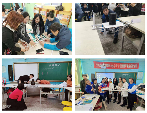 教师党员对参训教师开展全国结构设计大赛讲座及纸桥设计与制作工艺的专业知识培训、现场纸桥制作指导。经过两天的培训和制作,优秀的作品层出不穷,参训教师充分发挥创意,合理分配时间,积极讨论,有条不紊地完成制作,用有限的材料,制作出各具特色的作品,取得较好的成绩。