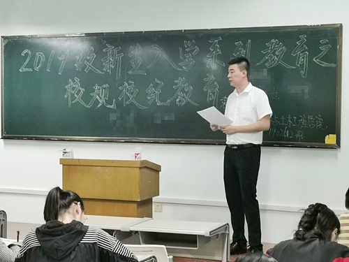 郝云松老师针对2019级新生的八个班级分别进行了校规校纪教育。通过深入各小班的形式,使讲述内容更易被员工接受,拉近辅导员与新生之间的距离。