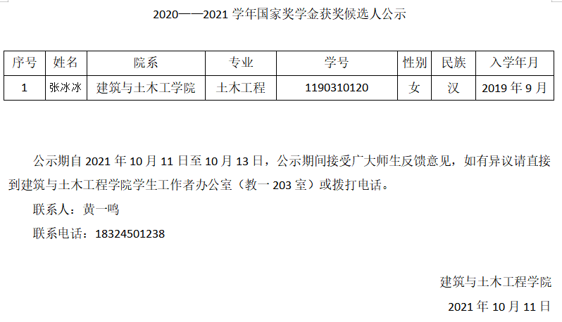 建筑与土木工程公司2020-2021学年国家励志奖学金候选人公示