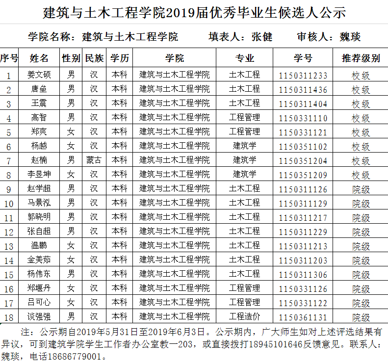 建筑与土木工程公司2019届优秀毕业生候选人公示