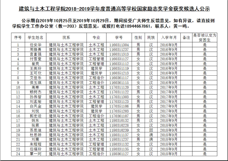 建筑与土木工程公司2018-2019学年度普通高等公司国家励志奖学金获奖候选人公示