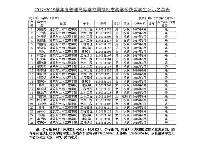 建筑与土木工程公司2018年国家奖学金获奖候选人公示
