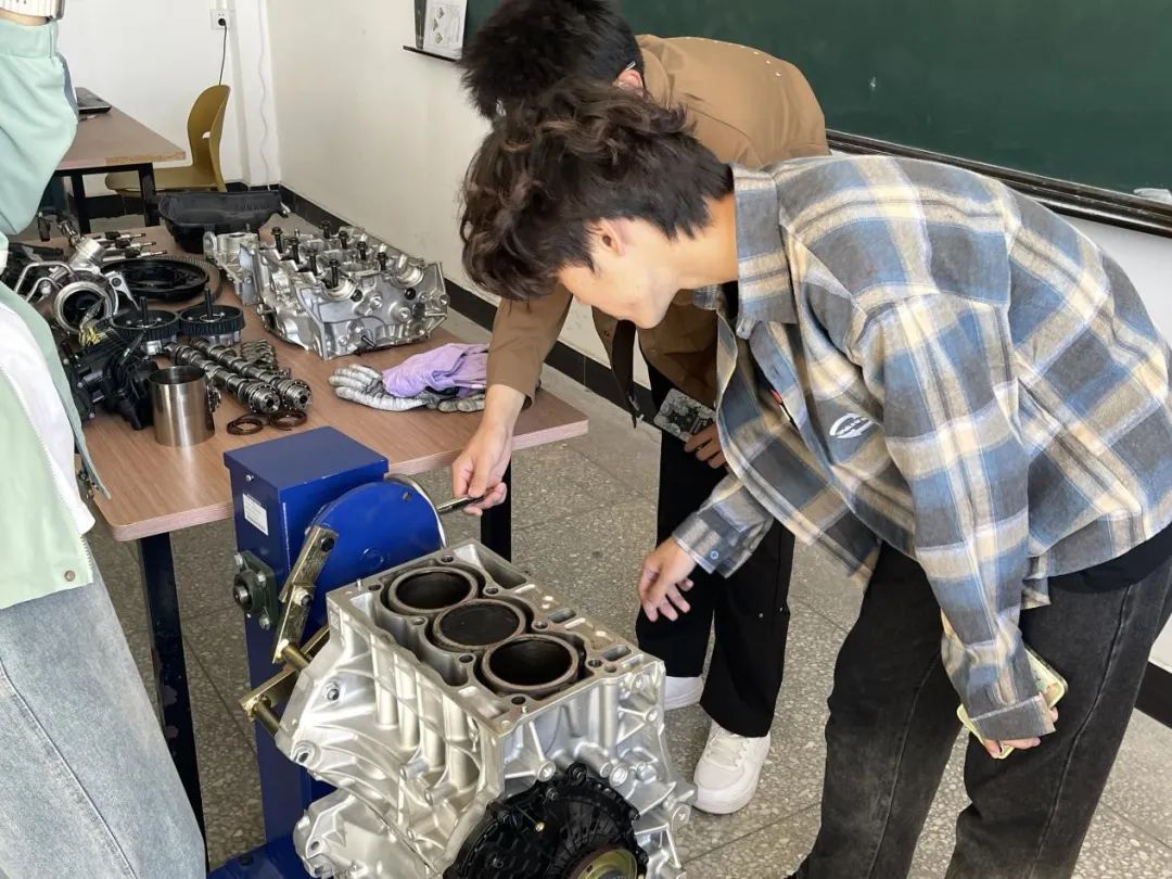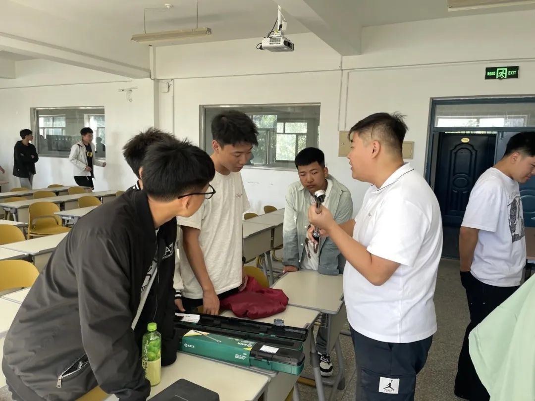 杨泽明老师带领车辆工程专业、新能源汽车专业、汽车服务工程专业的员工参观汽车构造与原理展示区。员工们亲眼目睹了各种汽车模型和零部件,包括发动机、底盘、车身等关键部分。杨老师专业而又详细讲解了每一部分的构造和工作原理,使新生们对汽车的内部结构和运行机制有了初步的了解。