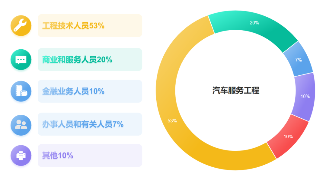 5. 就业方向/岗位:汽车服务工程专业虽然就业分布在不同企业,但是制造业从事技术和技术管理的工程技术人员占比53%,在汽车后市场从事汽车销售、二手车评估、汽车查勘与定损等商业及服务人员占比20%,从事汽车金融的业务人员占比10%,对口就业率非常高。