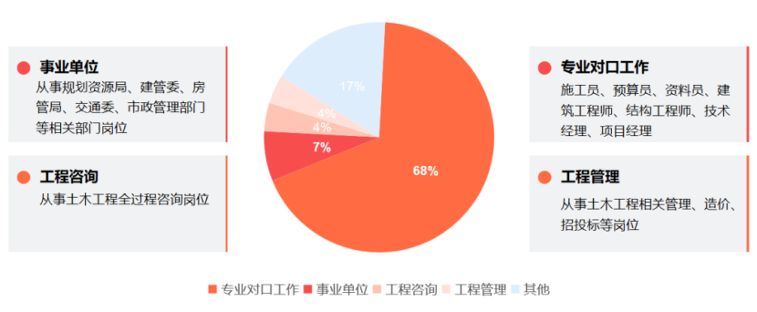 4. 就业领域/行业:土木工程专业就业主要的代表行业有:建筑和路桥施工单位、工程勘察设计单位、监理单位、工程造价咨询机构、房地产开发企业、大专院校、国家机关、事业单位等。