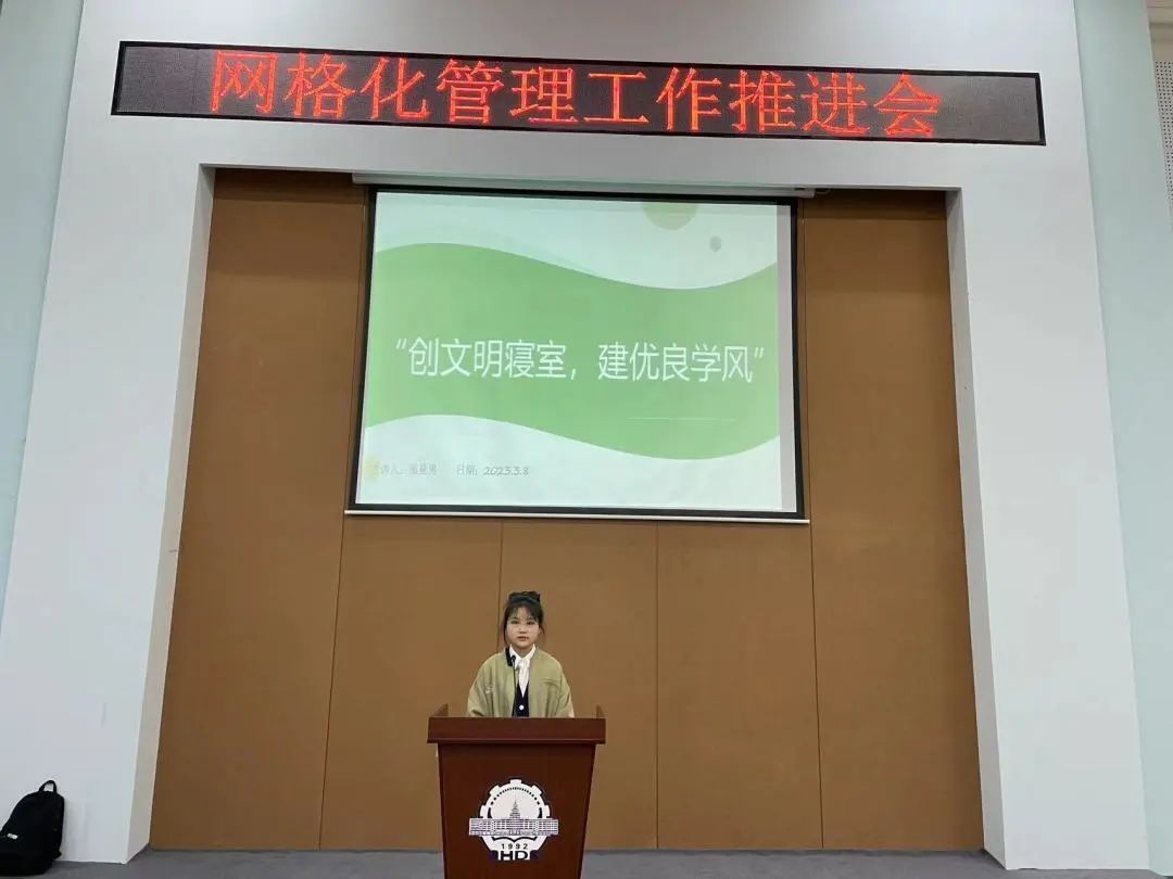 3月9日,公司召开网格化管理工作推进会,班长代表李天天同学、寝室长代表张立龙同学、优良学风寝室代表邬亚男同学依次发言,同学们分享了自身在网格化管理过程中的先进经验和做法。会议最后,公司员工发展中心主任黄一鸣老师总结讲话,他呼吁同学们进一步发挥网格管理作用,珍惜时间,养成良好学习习惯,营造文明的校园环境,建立和谐的同学关系。