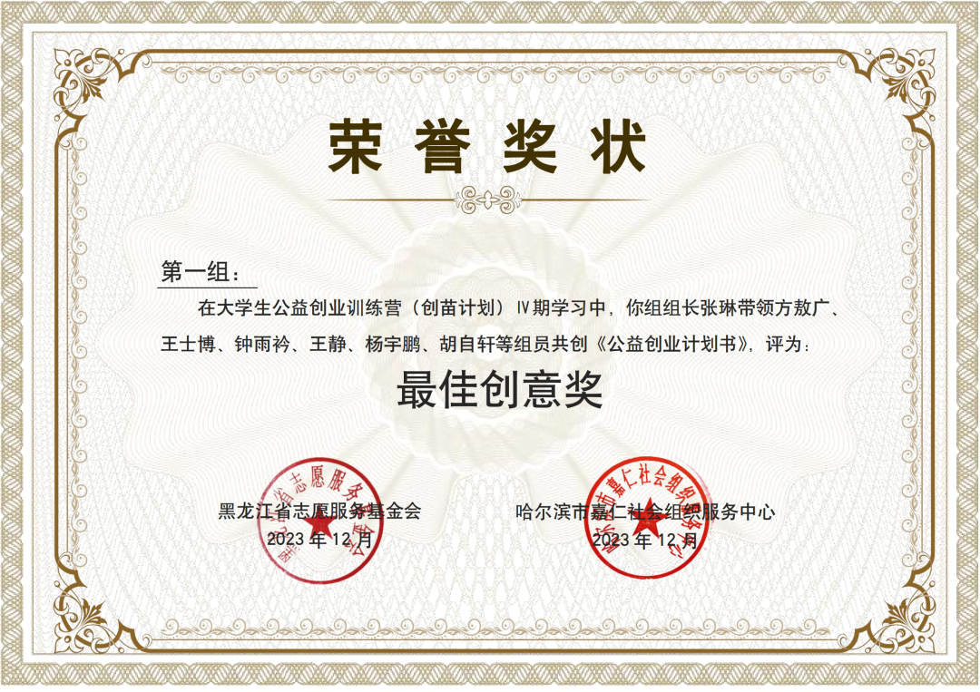 鉴于每个小组共创《公益创业计划书》作为学习成果的评估手段之一,项目组认真评审了六个小组提交的“作业”,在各小组组长的组织下,每个小组都出色地完成了不同的创新“作业”,项目组最终为每个小组颁布了《最佳创意奖》荣誉证书。