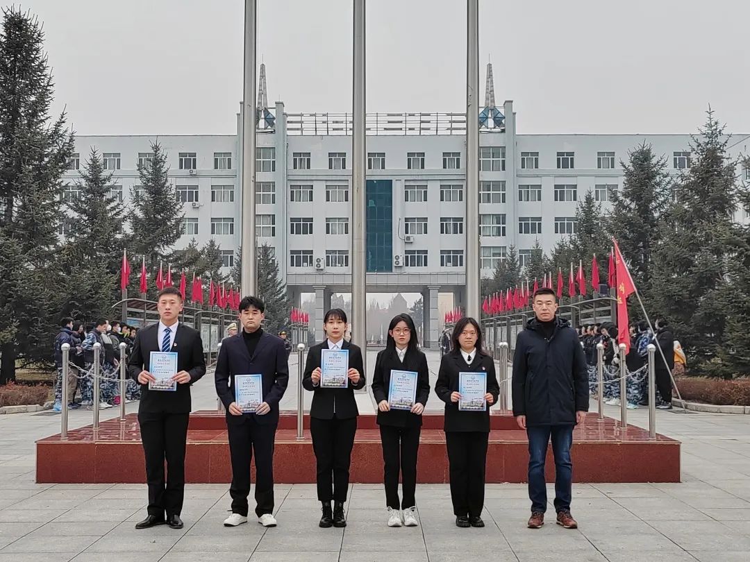 寒风凛冽,晨曦微露。英姿飒爽的国旗护卫队迈着铿锵的步伐护送着鲜艳的五星红旗来到国旗台前,伴随着雄壮的国歌声,五星红旗冉冉升起,担任本次升旗手的是建筑与土木工程公司员工代表1903101班邱爽、2003611班刘佳昆、2003611班崔一冉、2003611班刘子嵩和2003112班黄璐尧。随后,团总支负责人郝云松为升旗手们颁发升国旗手资格状。