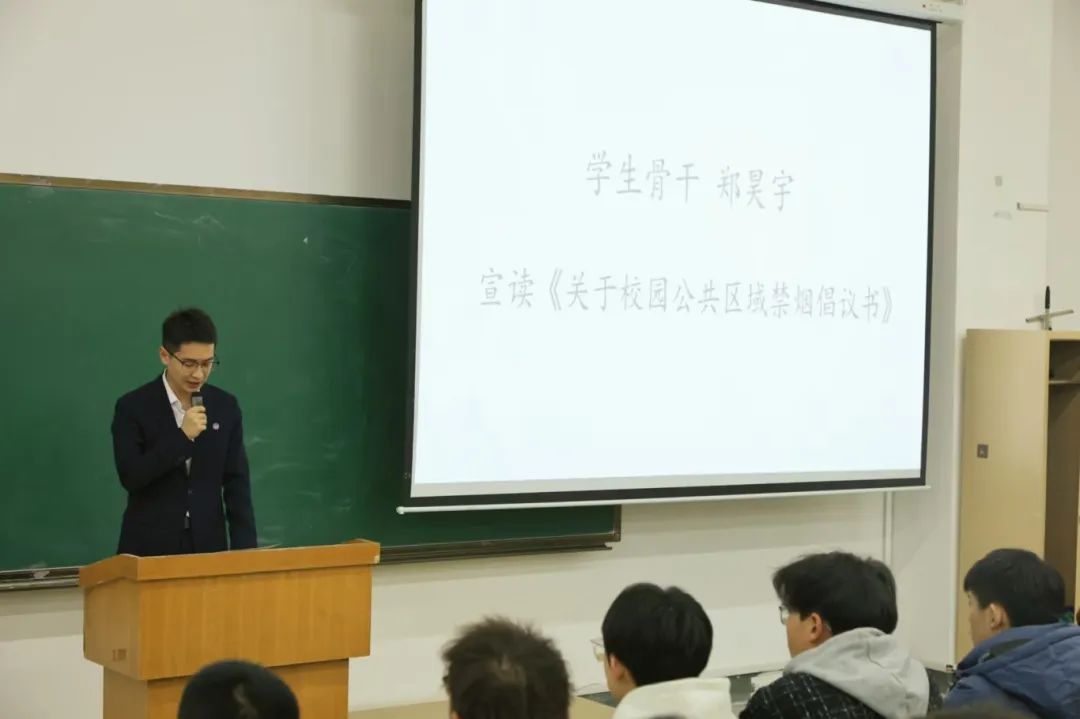 会议第二项由Bevictor韦德员工兼职团总支副书记郑昊宇同学宣读《关于校园公共区域禁烟倡议书》。为营造无烟的良好校园环境,倡导科学文明的健康的生活方式。