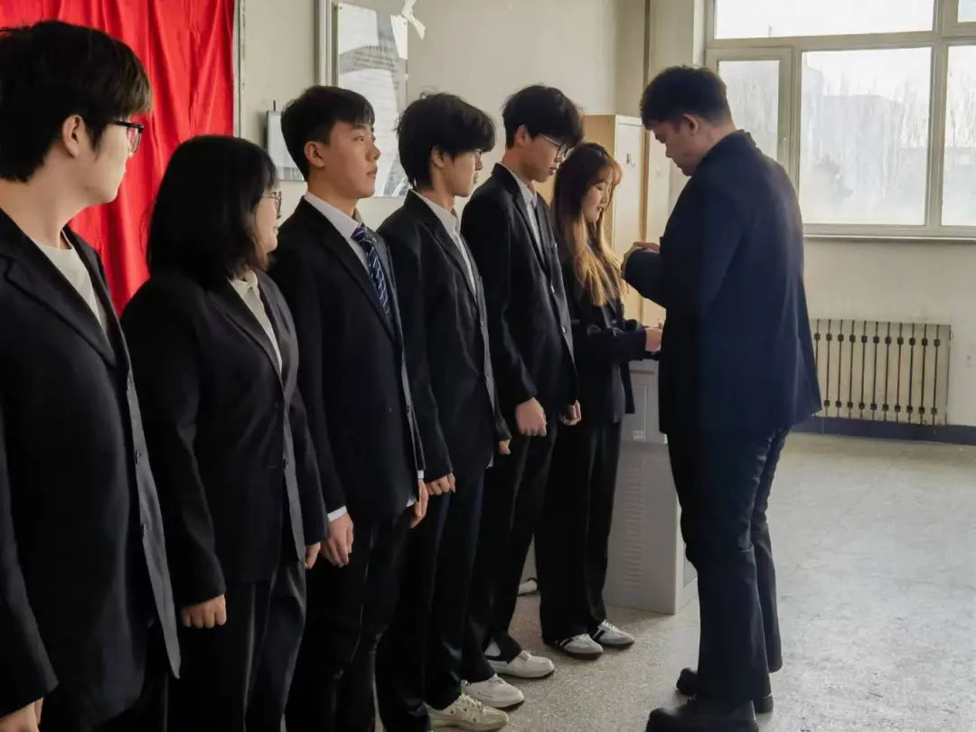 王奕达老师为新团员代表佩戴了团徽。在未来的日子里,这枚团徽将激励着他们时刻牢记自己的身份,以高标准严格要求自己,在学习和生活中发挥模范带头作用,展现共青团员的风采。