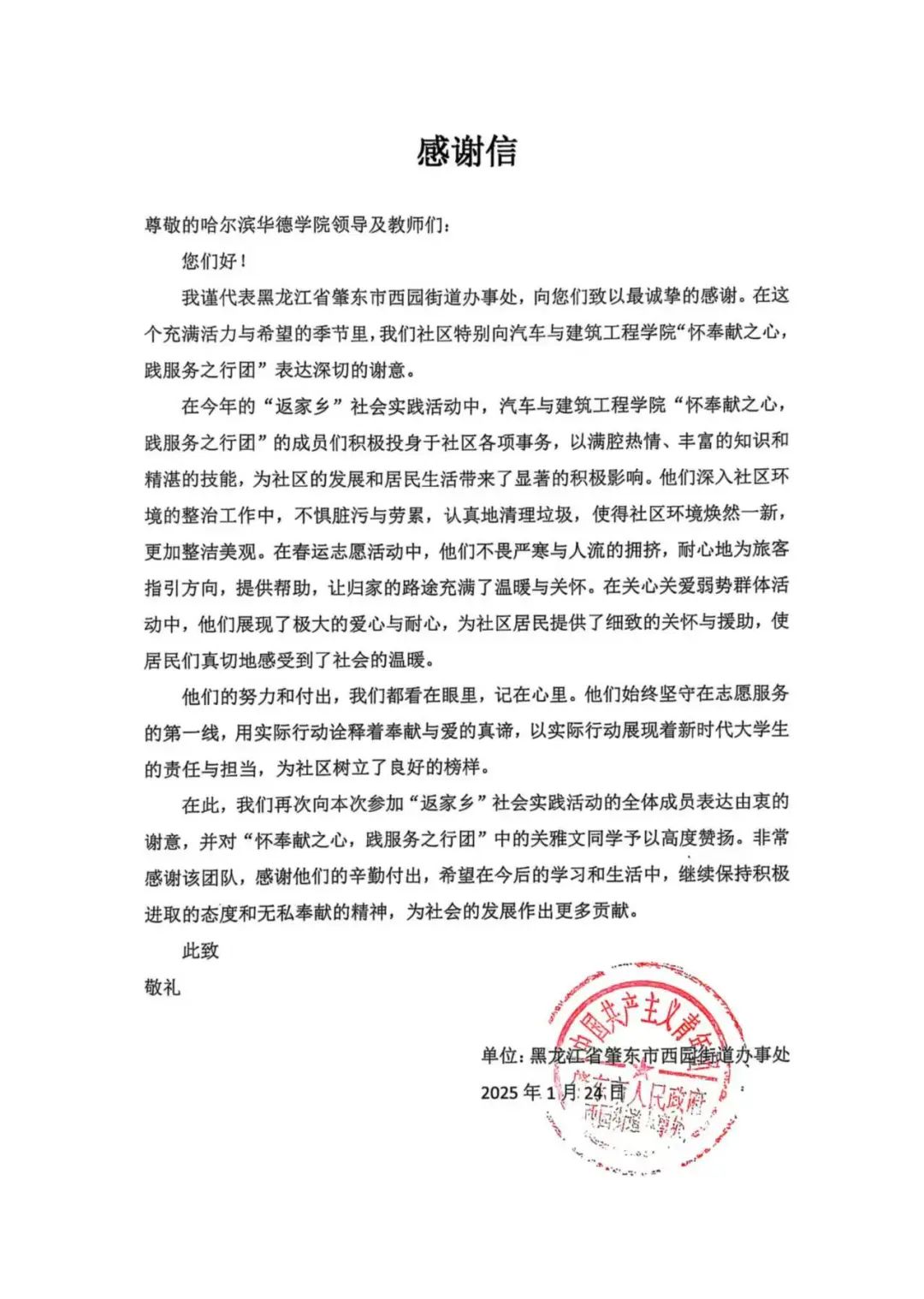 为切实响应党和国家的号召,贯彻社会主义核心价值观,引领广大青年学子通过“返家乡”参与社会实践,为基层治理贡献力量,1月8日-1月24日,汽车与建筑工程院“怀奉献之心,践服务之行团”前往黑龙江省肇东市,开展以“参与社会实践,贡献美好家乡”为主题的社会实践活动,以实际行动为家乡的发展贡献青春力量。