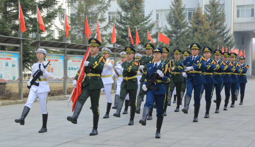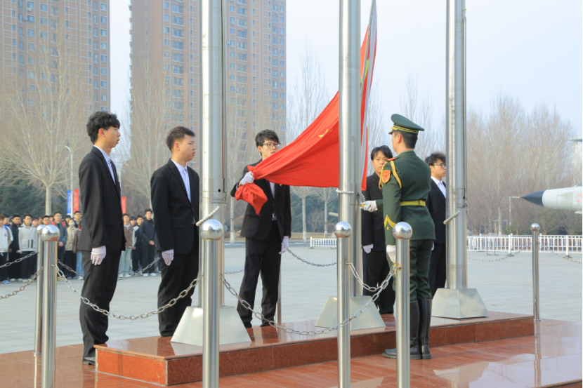 升旗仪式在国旗护卫队铿锵有力的口号中正式开始。在全体师生的注目下,国旗护卫队迈着整齐划一的步伐护送国旗入场,师生们齐唱国歌,鲜艳夺目的五星红旗冉冉升起、迎风飘扬。