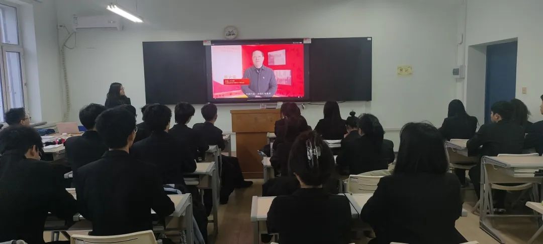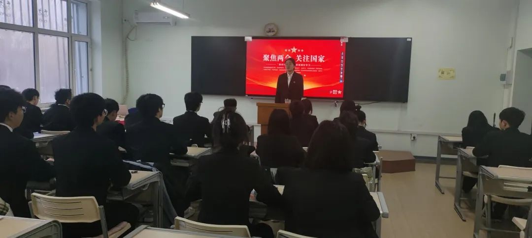 在视频学习环节,同学们首先观看“两会”会议回放视频,集体学习全国两会精神。在领学环节,“新时代先锋”宣讲团理论学习部负责人刘雨欣同学,带领大家一起学习了解“两会”精神的核心要义,进一步激发了同学们的爱国热情和社会责任感。