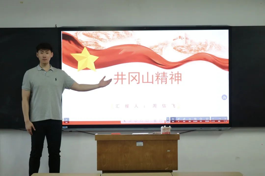 在此次活动中,周信飞同学主要介绍了井冈山精神的主要内容、历史背景让同学们深入了解、学习井冈山精神的核心。他讲述了身为新时代青年应该如何理解、发扬、传承井冈山精神,进一步激发了同学们的爱国热情。