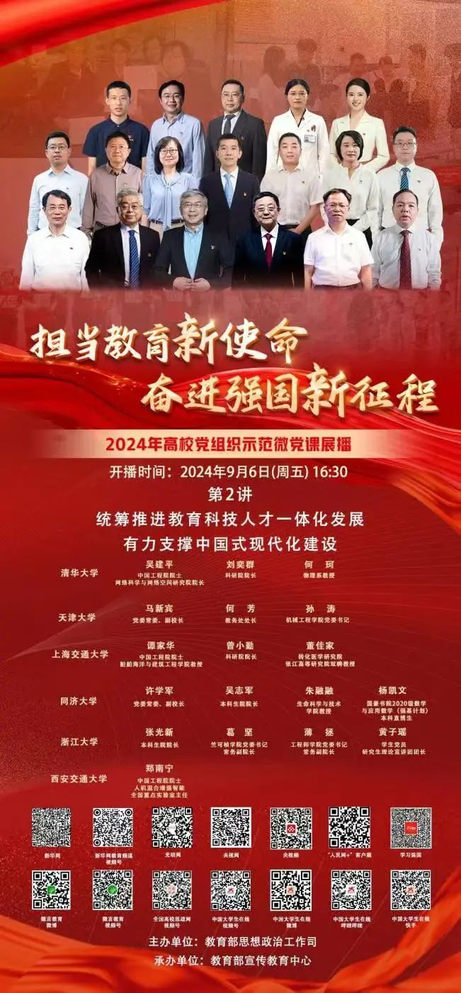 本期微党课是由清华大学、天津大学、上海交通大学、同济大学、浙江大学、西安交通大学6所高校的知名学者、教师及员工党员代表共同讲授。授课人结合政策阐释、优秀人物事迹、典型事例等,深入浅出的阐述了“教育、科技、人才是中国式现代化的基础性、战略性支撑”的丰富内涵,强调教育、科技、人才的协同融合发展,对于推动国家经济社会高质量发展、实现第二个百年奋斗目标具有重要意义。