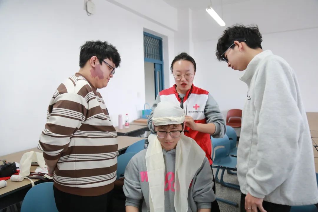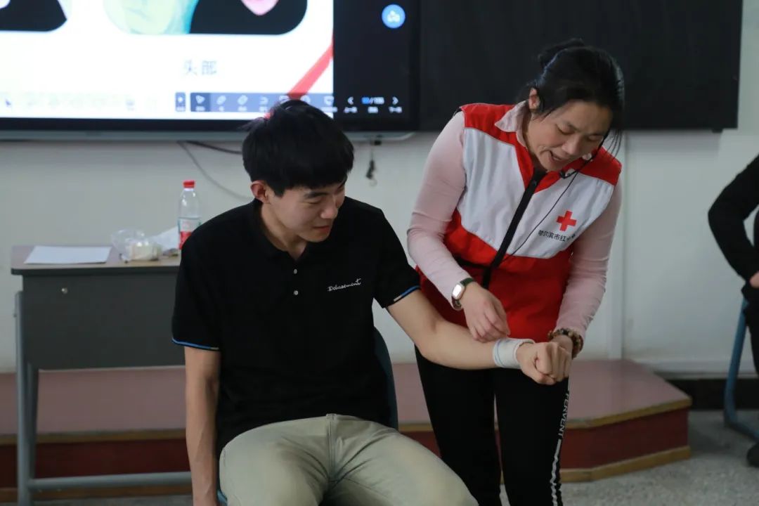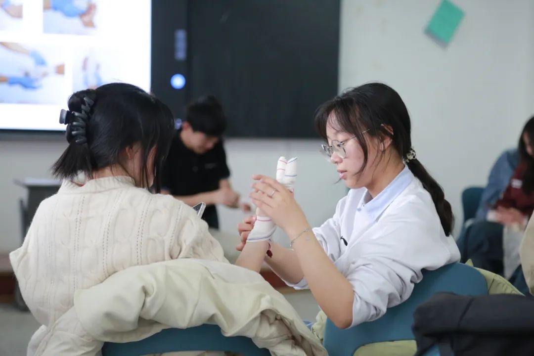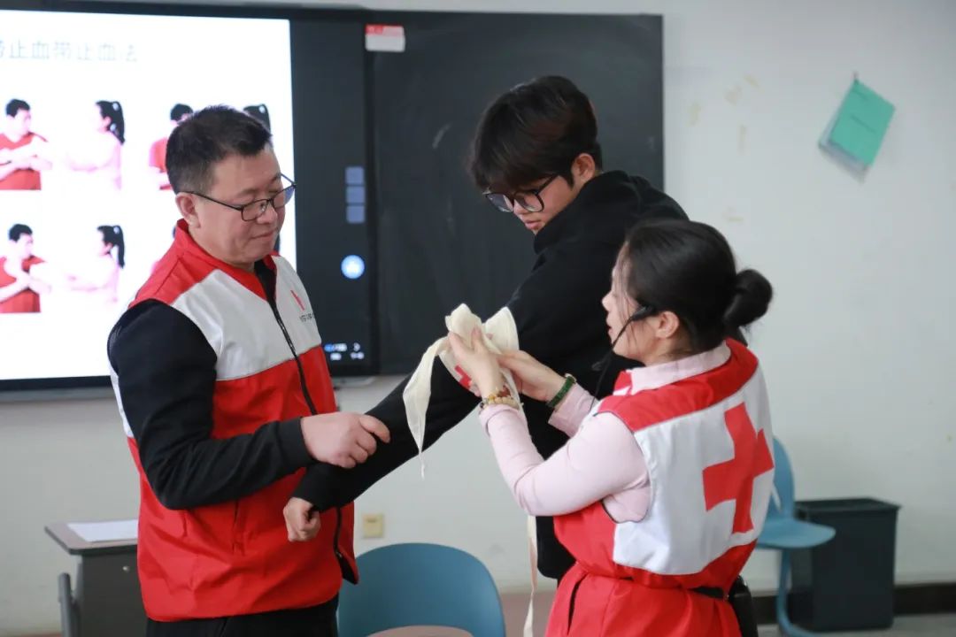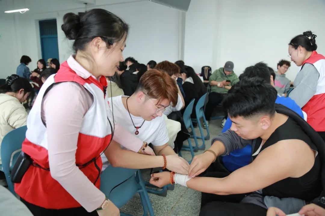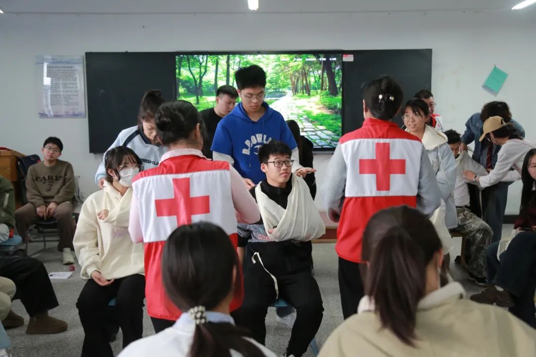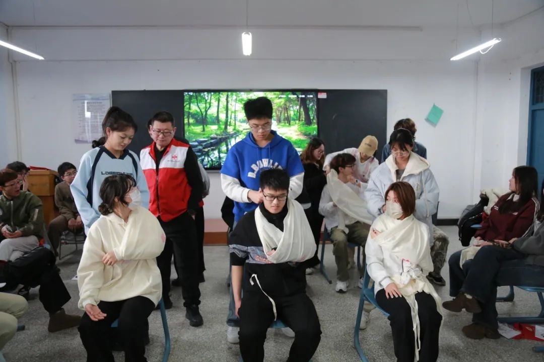 在第二期的培训活动中,宣讲团成员学习了专业的紧急情况处理知识和特殊伤口包扎手法。通过模拟真实场景,让同学们了解和掌握如何处理包括气道异物梗阻处理、止血包扎、骨折固定、烧伤处理在内的急救全过程,进一步帮助广大青年学子真正做到“遇事不慌,有效应对”。