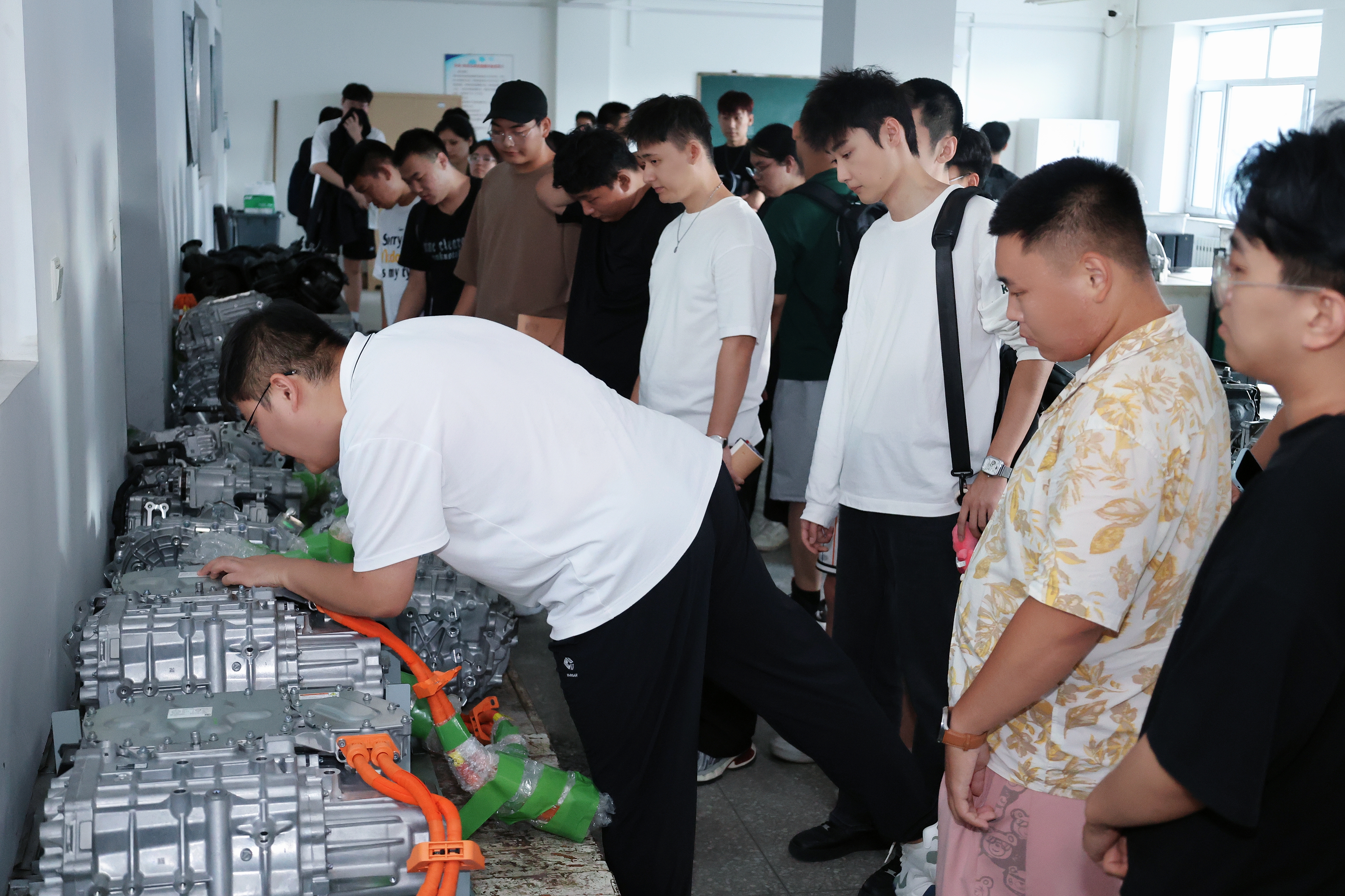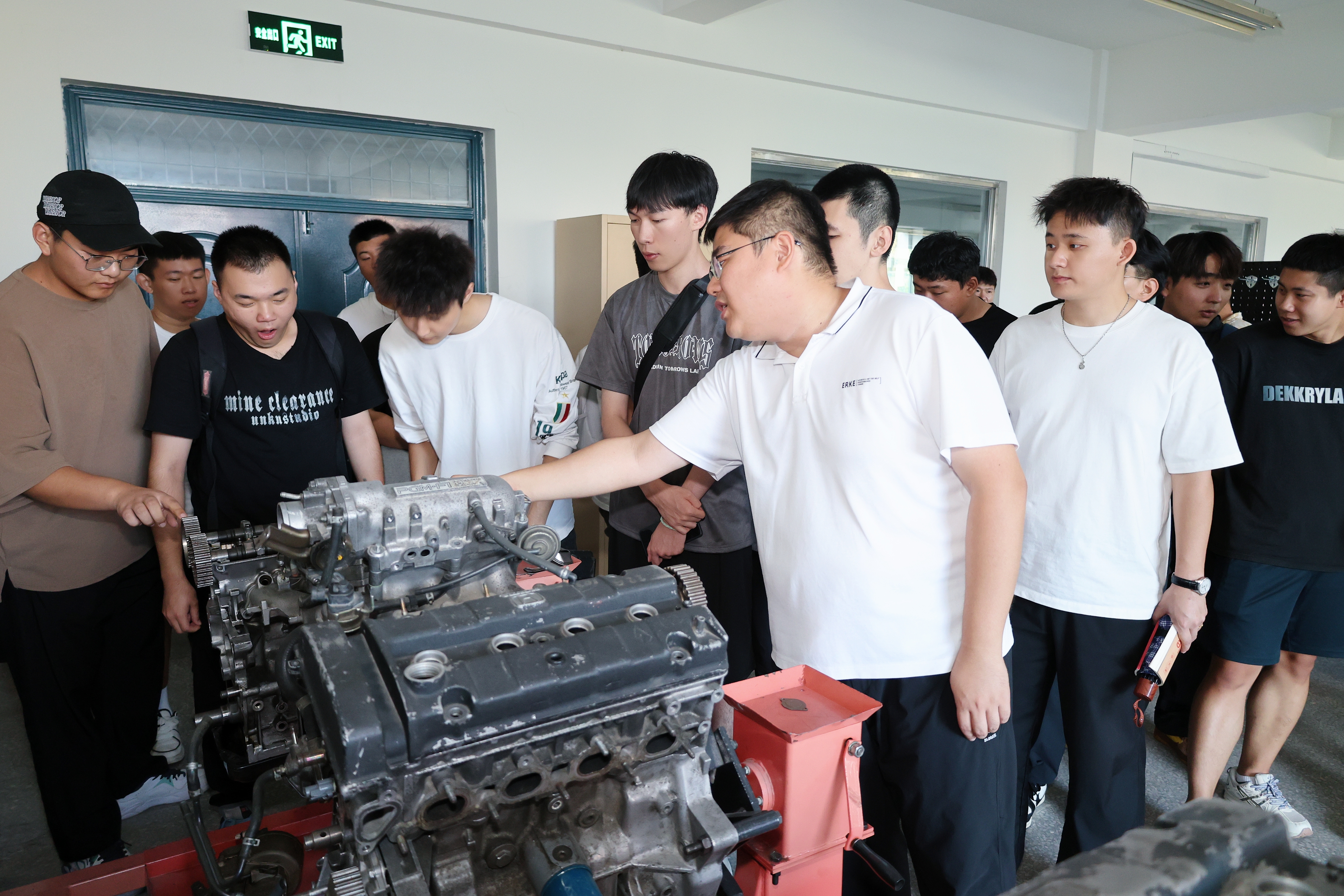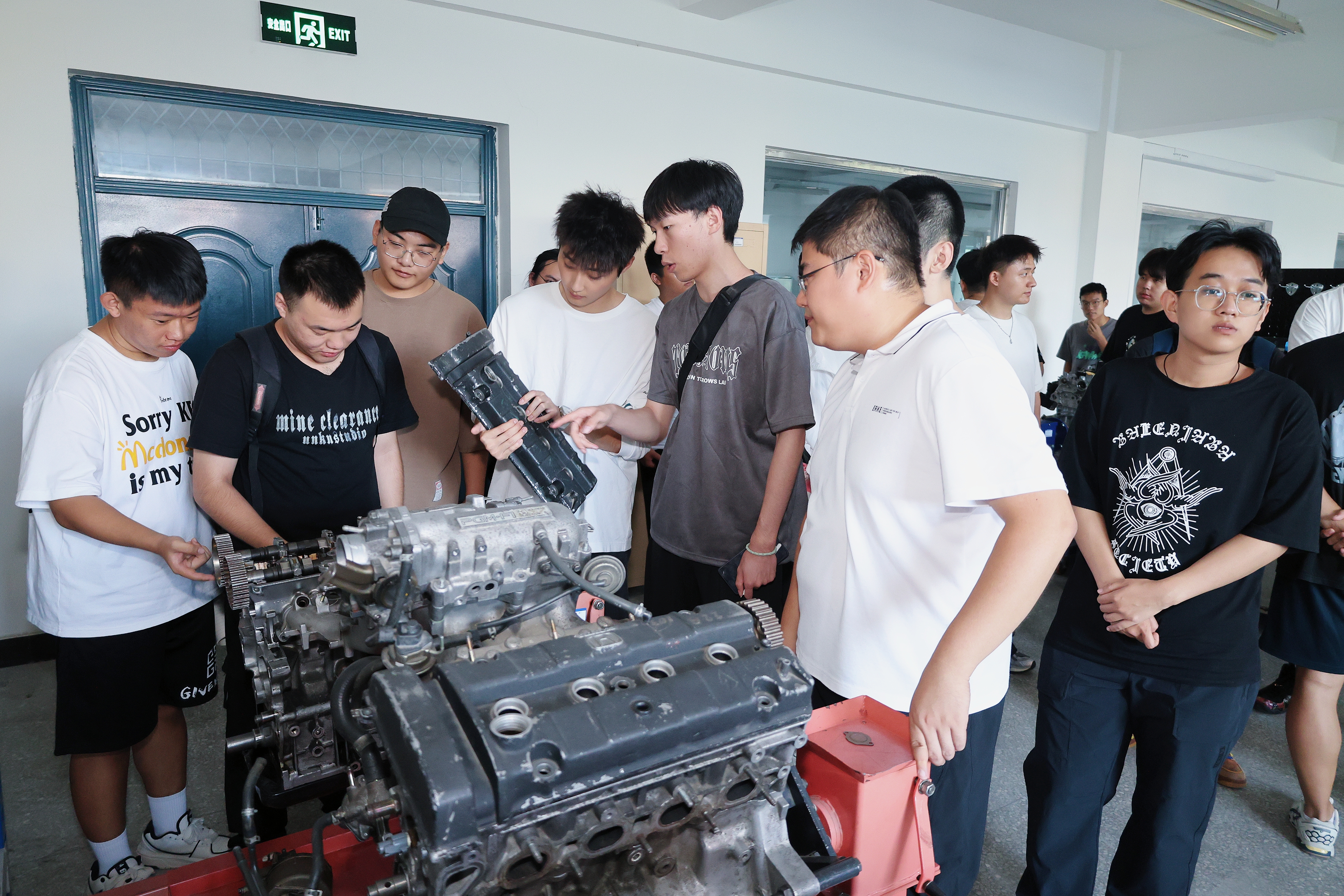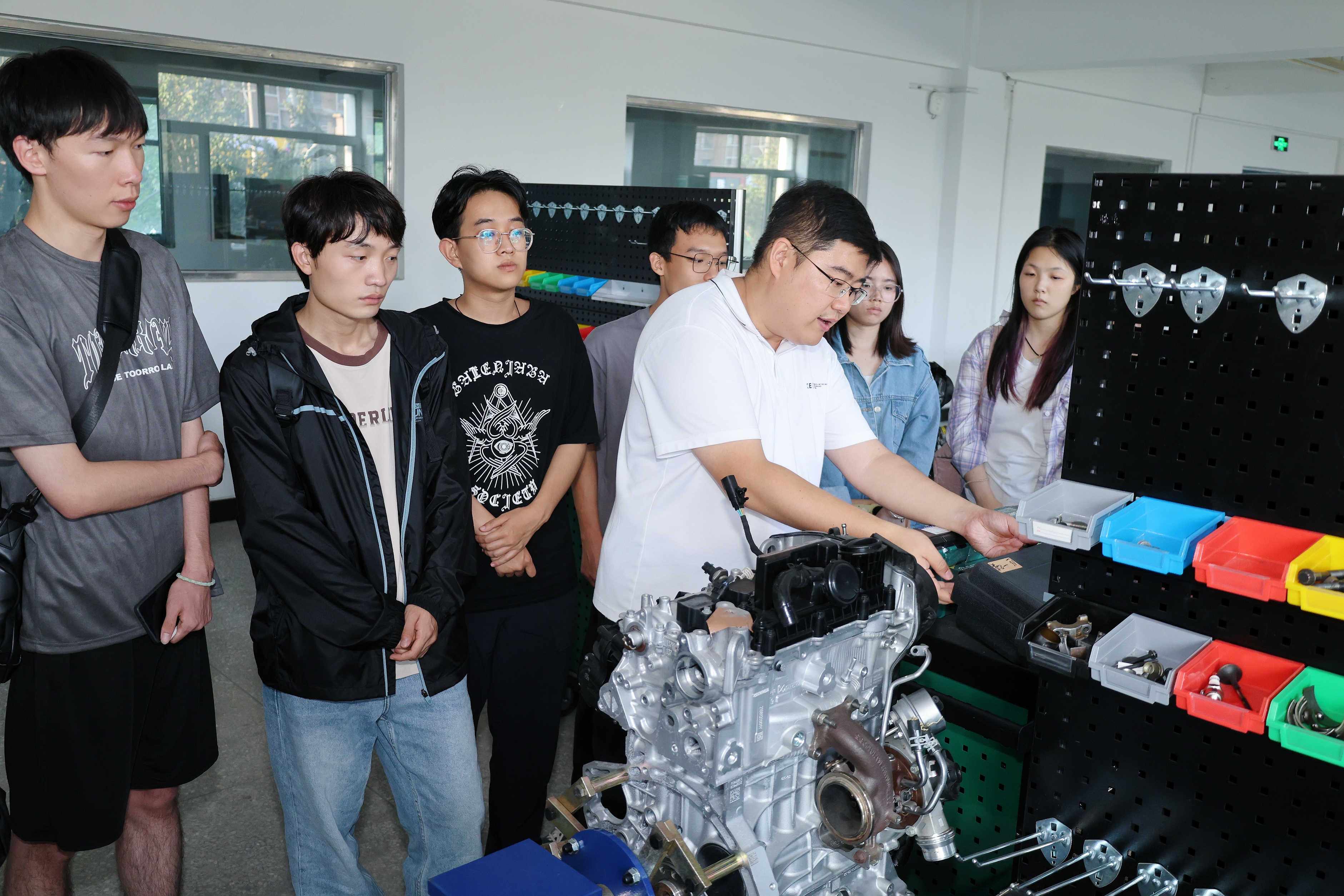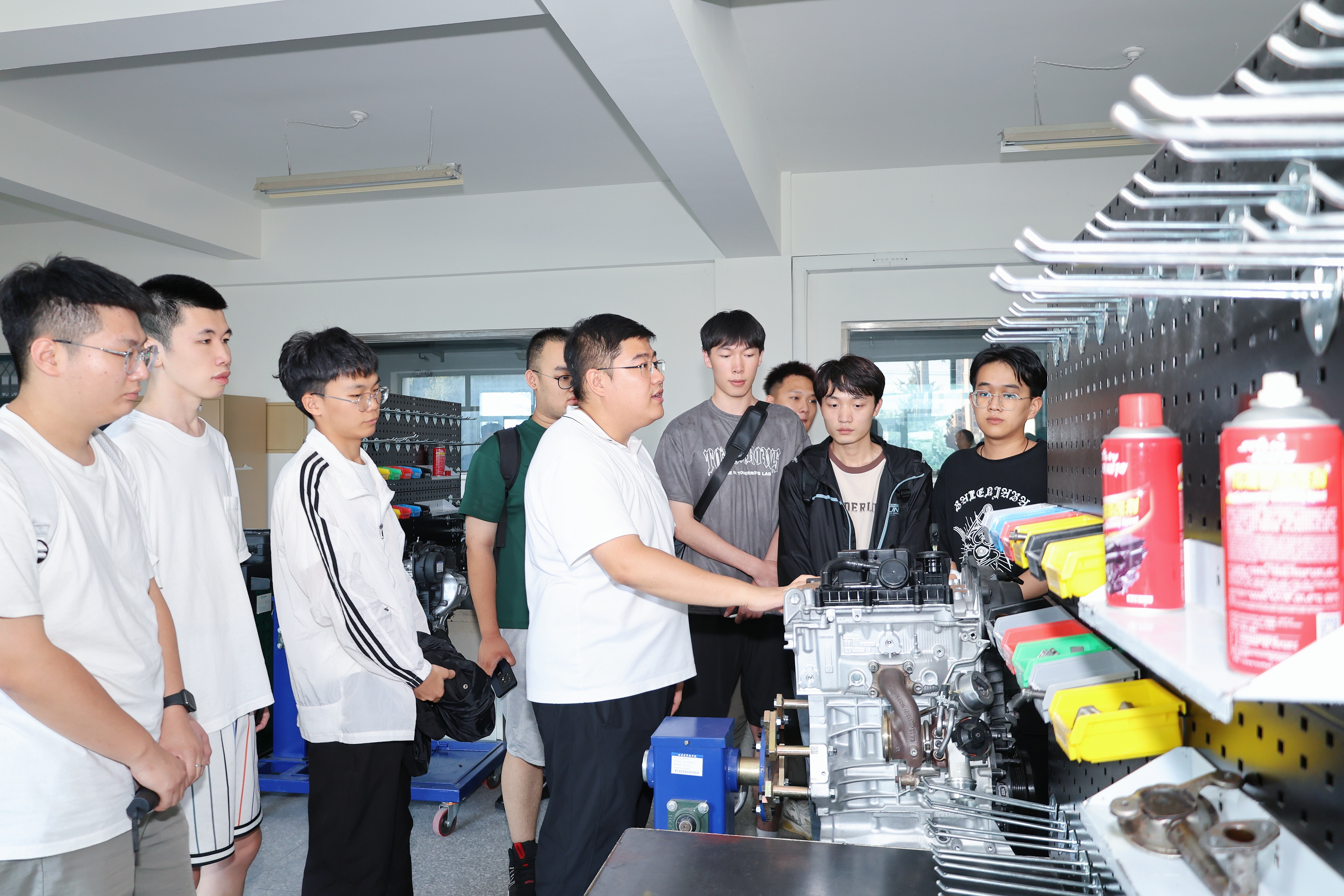 同时,杨泽明老师带领交通运输专业新生进入到零部件设计工作站、零点实验室,一件件实验器材映入眼帘,随后对汽车底盘实验室、汽车钣金实验室、微型发动机实验室、自动变速器实验室展开了介绍,并针对实验室布局、零件设备等内容分别进行详细地讲解。杨泽明老师就基础操作进行现场示范,帮助同学们切实了解实验室的主要功能与各类设备的具体用途,进一步提升了同学们的专业实践能力。