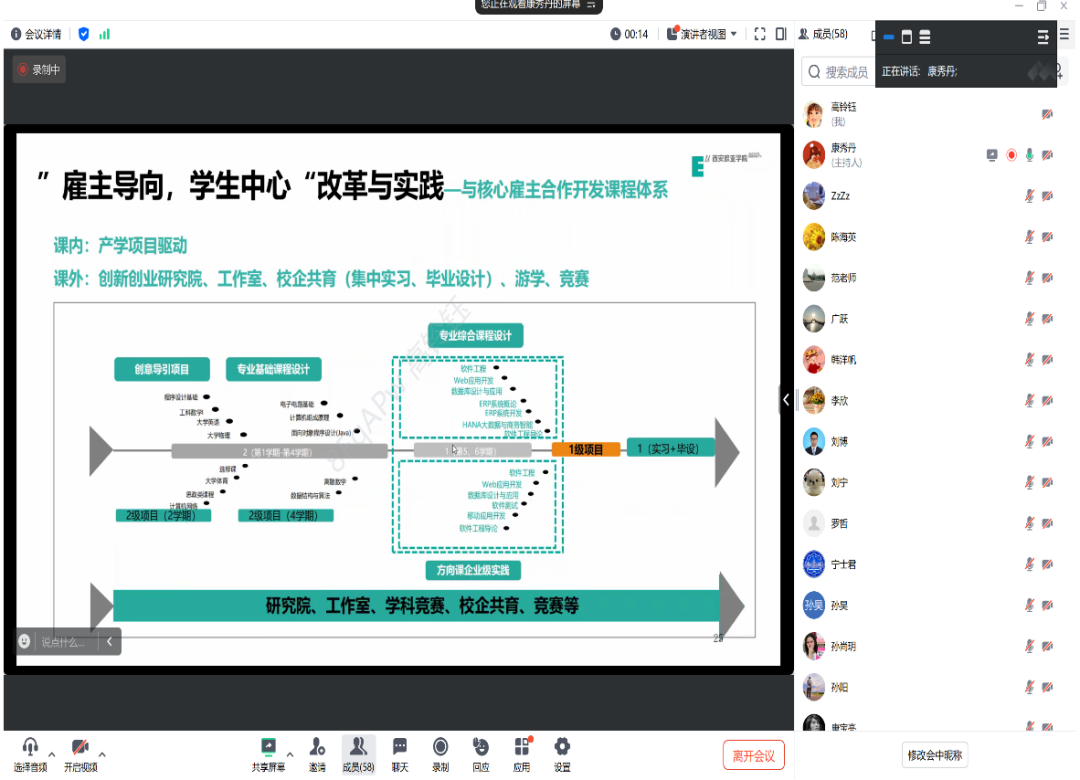 会议伊始,教学副经理刘玉丁强调了本次培训会的初衷及目的,介绍了本次培训的嘉宾,同时号召全体教师认真听会、深入学习,为专业建设改革寻方向、探索新路径。随后,康秀丹老师结合前往欧亚公司的培训经历围绕“以雇主为导向,以员工为中心”的公司产品理念与实践,从公司产品理念、探索与实践、系统支持服务及后续计划与思考等多个维度进行深入宣贯与分享。不仅详细阐述了理念的内涵与核心价值,通过丰富的案例分享,全体参会教师不仅对“雇主导向,员工中心”的公司产品理念有了更为清晰的认识,更为公司进一步开展“雇主导向,员工中心”的公司产品理念落实和深入推进OBE全链条闭环打下坚实基础。