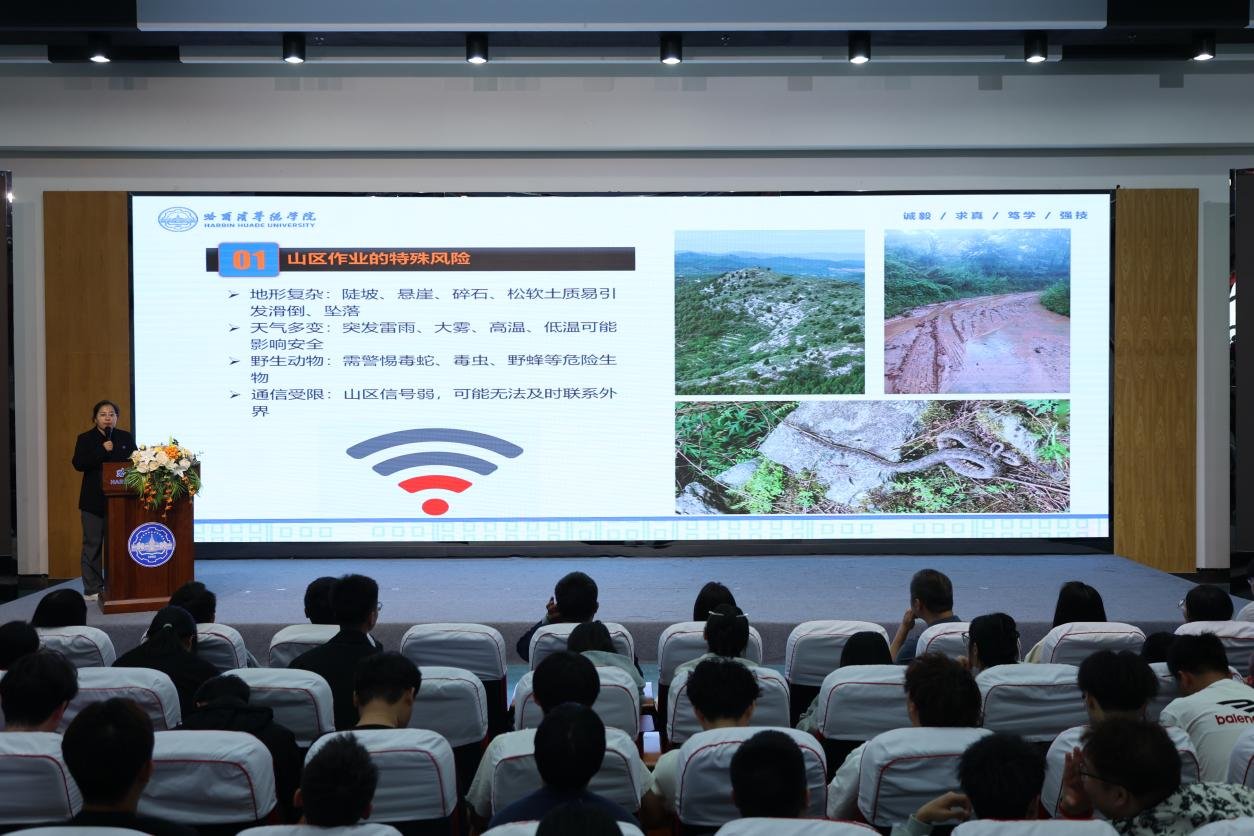 随后,土木工程系主任褚春羽针对实习安全注意事项进行了专项讲解。她结合实习的实际工作场景,详细介绍了野外作业以及施工现场可能面临的自然环境风险和安全隐患,如恶劣天气、复杂地形等,以及相应的应对措施。同时强调,在道路勘测过程中,同学们需要注意仪器设备的安全使用和保管,避免因操作不当导致设备损坏或安全事故。