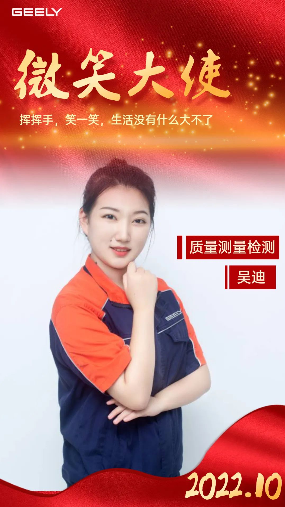 作为职场新星,入职一年的吴迪已经掌握了“三坐标编程”技能,可以独立完成一些汽车零部件的检测、分析工作。在项目空闲之时,吴迪多次发布质量成果汇报,助力吉利各大子公司的改善践行活动。参与吉利集团雷神特战队,为终端市场解答销售顾问常见的动力难题,为市场销售赋能。吴迪坚信,每一点积累,都是为了丰满一飞冲天的羽翼;每一次出发,都是为了拓展前方更广阔的路。青春路上,她珍惜年少时光;奋斗路上,她勇攀前路高峰。永不退缩,是她继往开来的步伐。