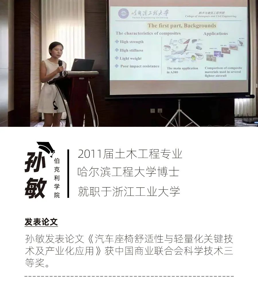 我的代名词,坚持和努力,经过一年的努力学习与不断提升,孙敏学成回国,面对其他高薪工作,孙敏毅然选择投身祖国教育事业。在应聘到浙江工业大学后,孙敏发表论文《汽车座椅舒适性与轻量化关键技术及产业化应用》获中国商业联合会科学技术三等奖。如今,孙敏正用自己的所学知识,为行业的不断进步和发展贡献力量。