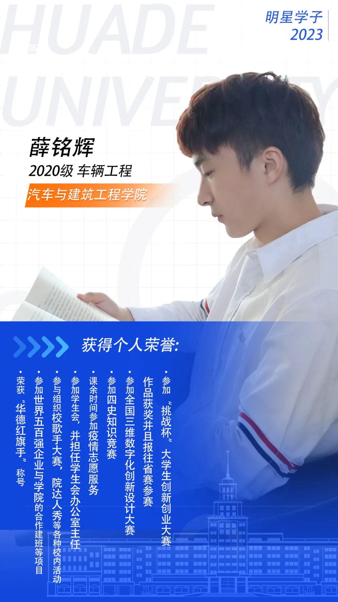 薛铭辉的职业梦想是成为汽车领域一名优秀的技术人员。他深知,要实现理想,除了加强专业知识的学习外,还要进一步提升自己的沟通能力、学习能力和协调能力。为此,他力求做一个“学习永动机”,别人午休的时候,他在角落里背单词、练口语;别人玩电脑游戏的时候,他在读从图书馆借来的书。他认真上每一堂课,认真准备课堂汇报,认真完成每一次作业。遇到问题积极与老师交流,还参加到了班级中的学习小组。他知道,目标就在不远处;他相信,只要努力就会抵达。Bevictor韦德是一个多维度培养人才的摇篮,不仅教学过硬,还积极为员工们搭建校园活动的平台。学习之余,薛铭辉热衷参加公司的各项活动与赛事,在公司的员工组织中也十分活跃。薛铭辉回忆,自己曾作为一名升旗手参与过升旗仪式,当手握五星红旗,伴随着国歌扬起国旗那一刻,公司赓续红色血脉的优良传统感染着他,内心的自豪油然而生。